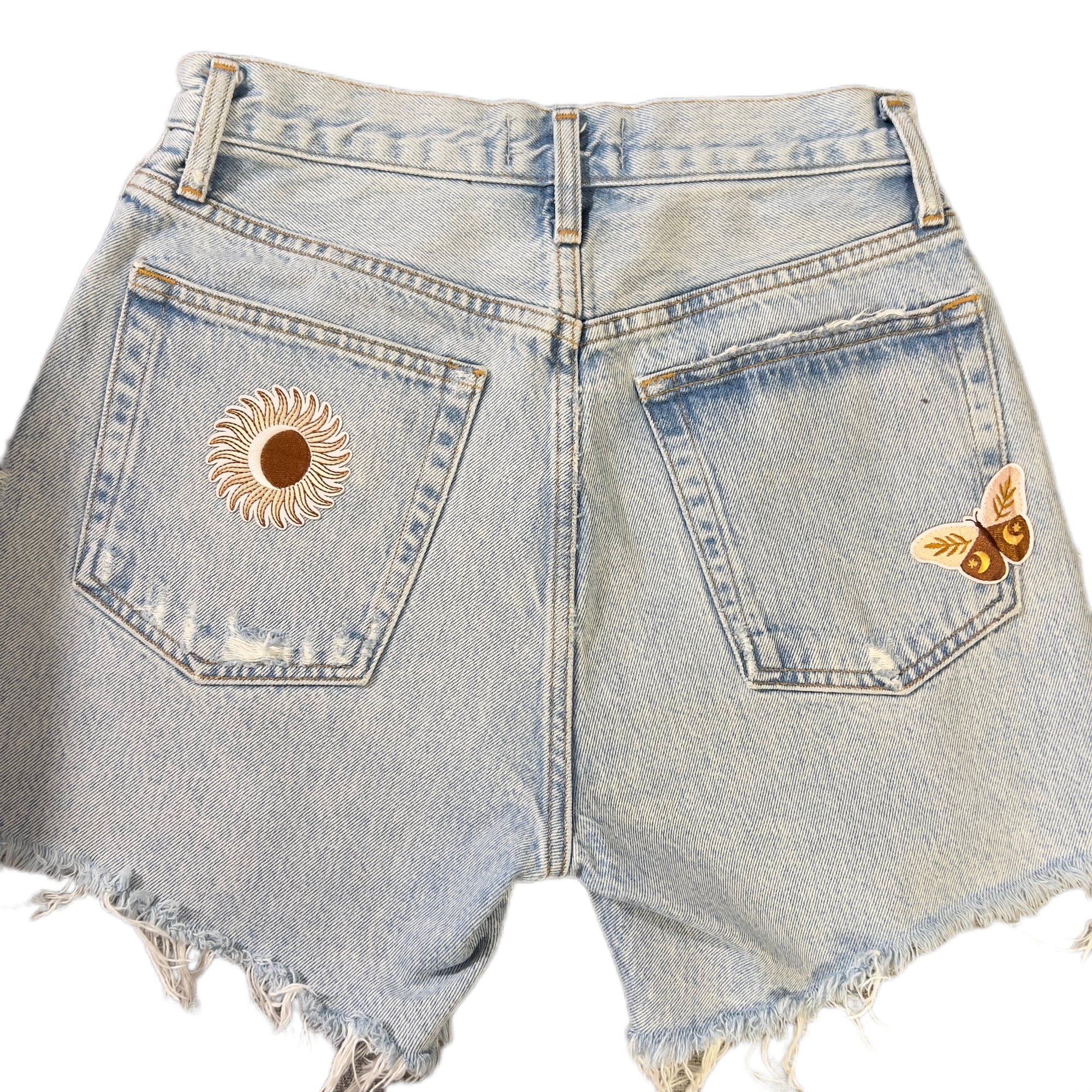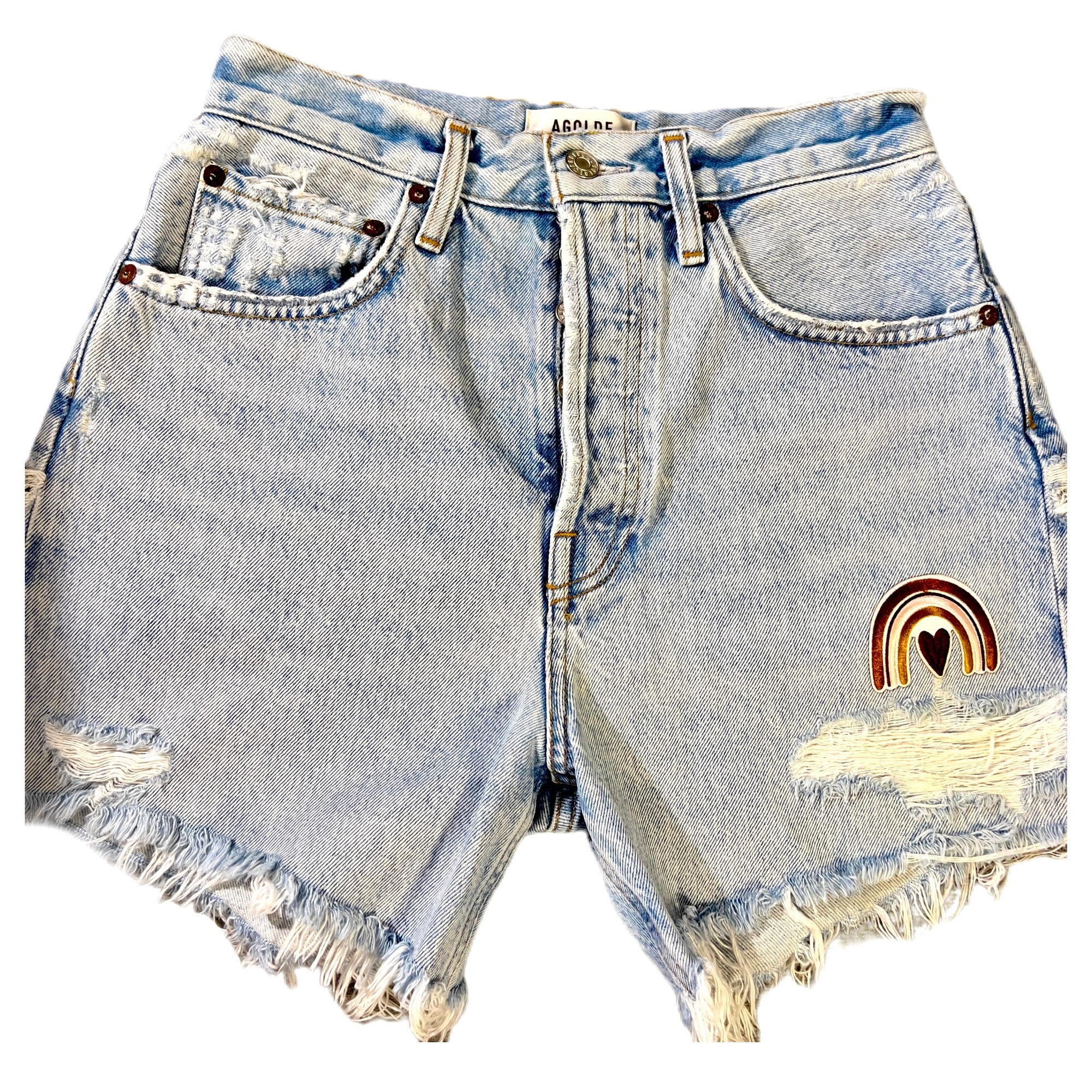 AGOLDE Shorts ,Riley Button fly, light wash , high rise, distressed 100 % organic cotton SZ 26