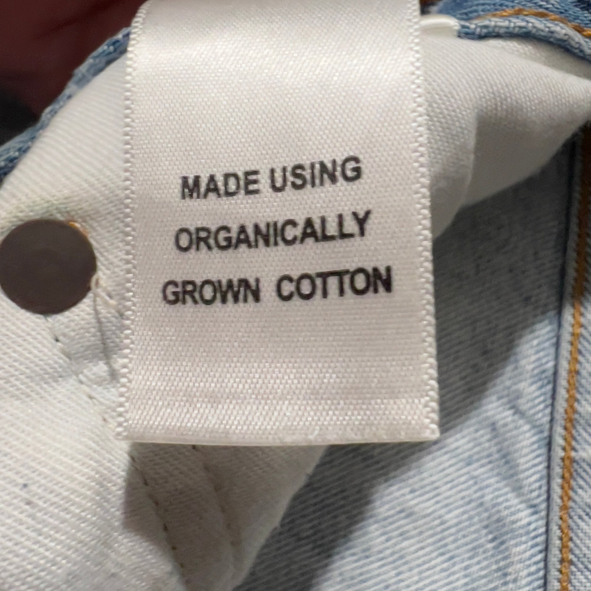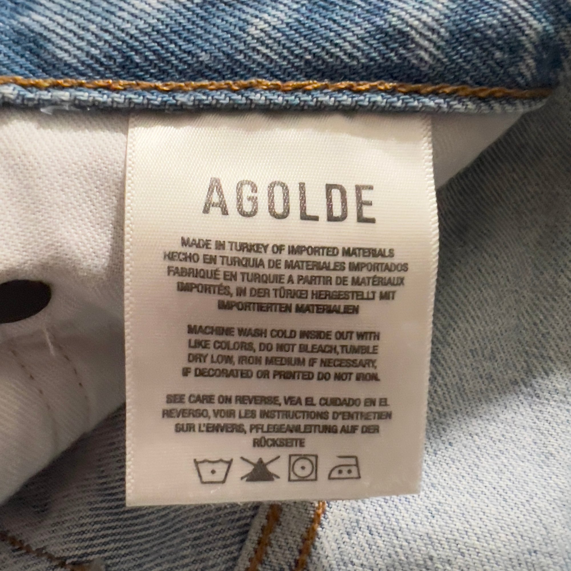 Agolde jean shorts , Riley is a high rise relaxed cut , 100 % organic cotton , The AGOLDE Women's Parker Long Cut Off Denim Shorts are made of 100% cotton and have a button closure. The shorts are high-waisted and have a relaxed fit. They feature a 5-pocket design and a fringe accent. The fabric wash is light medium and the shorts have a distressed look. The AGOLDE brand is known for its quality and durability. These shorts are in perfect condition.button fly ,