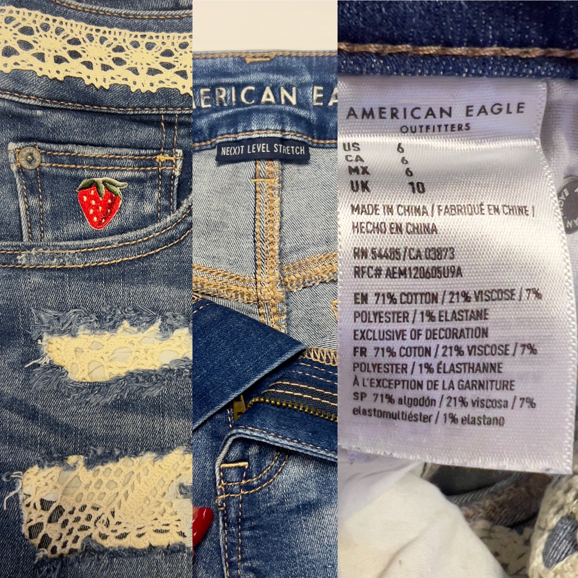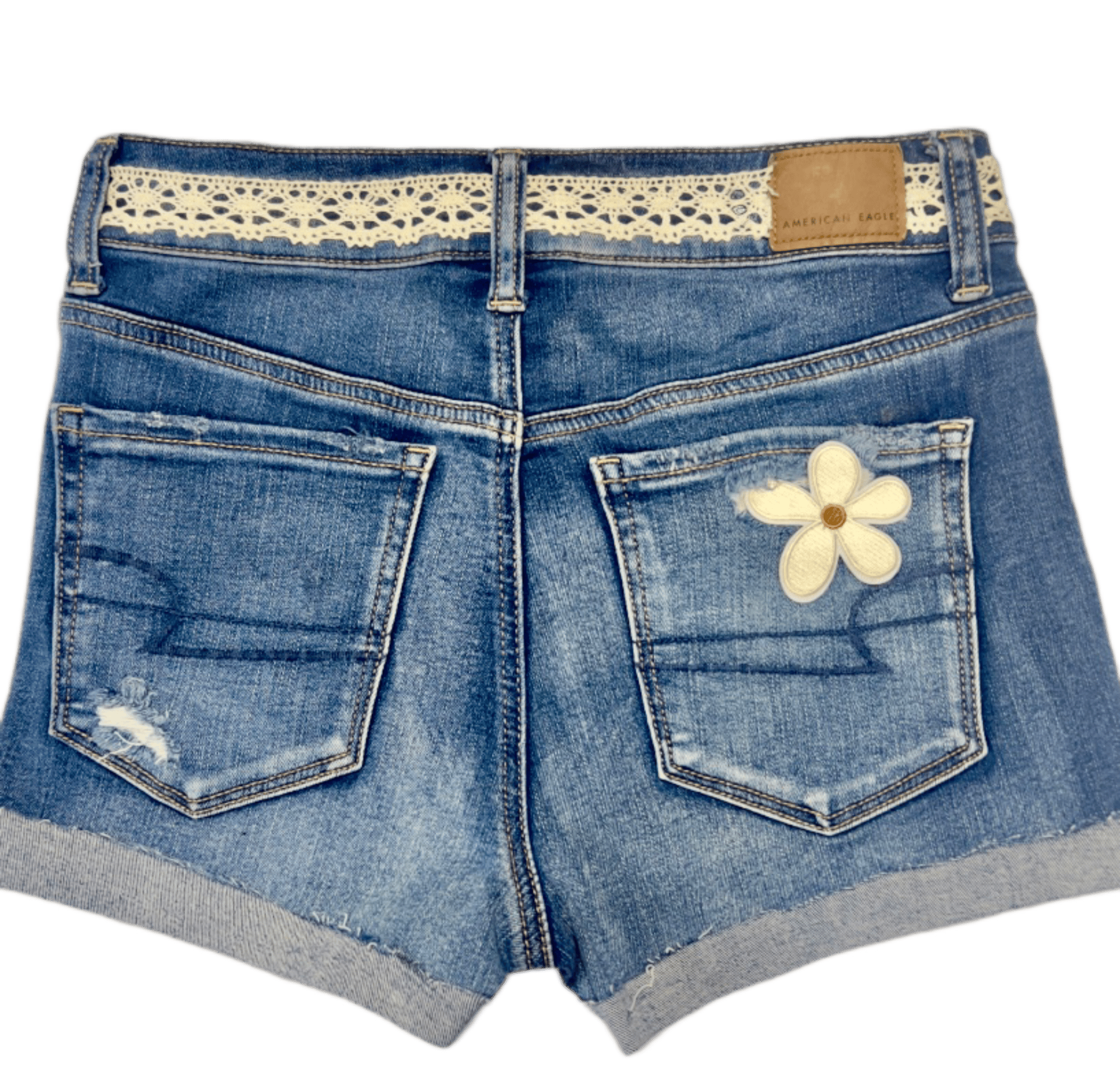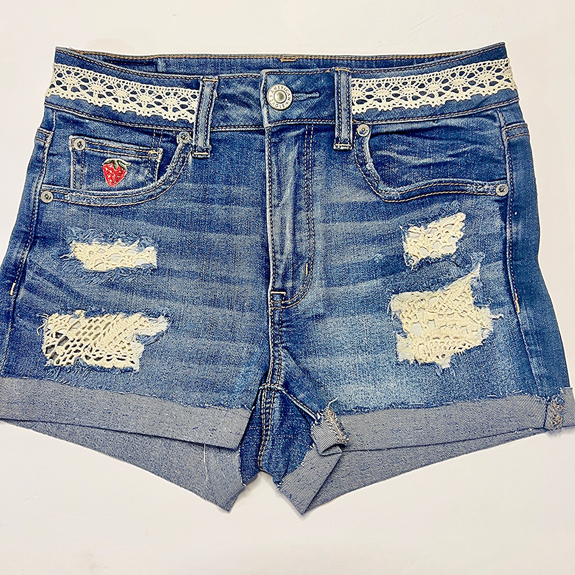 American Eagle distressed dark denim cut off shorts w-ivory crochet peeking through