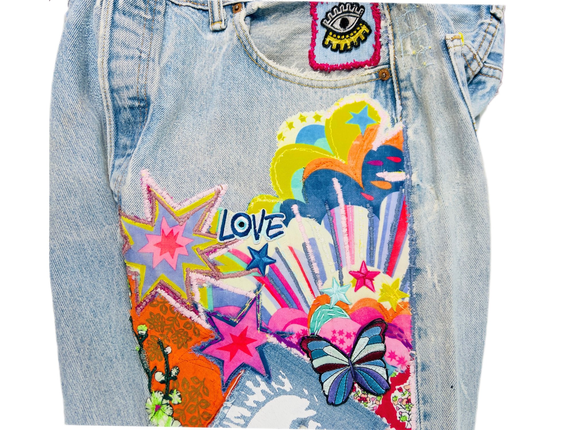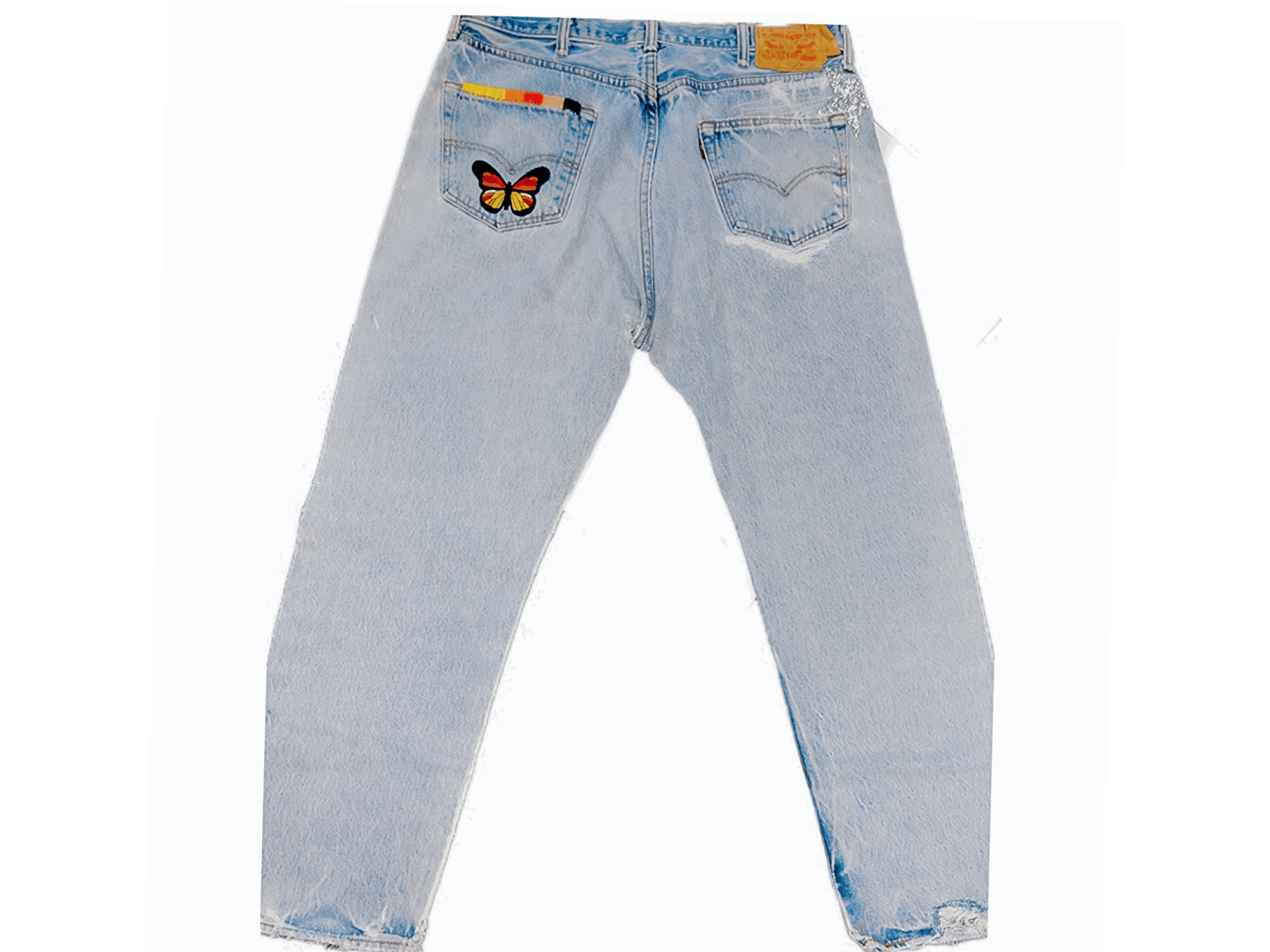 Back pocket has a butterfly patch + embroidery.