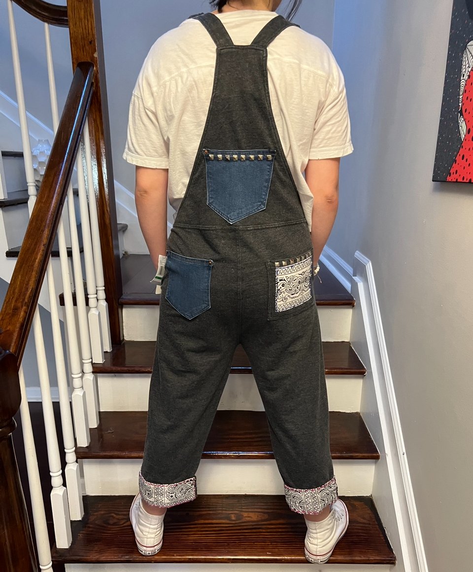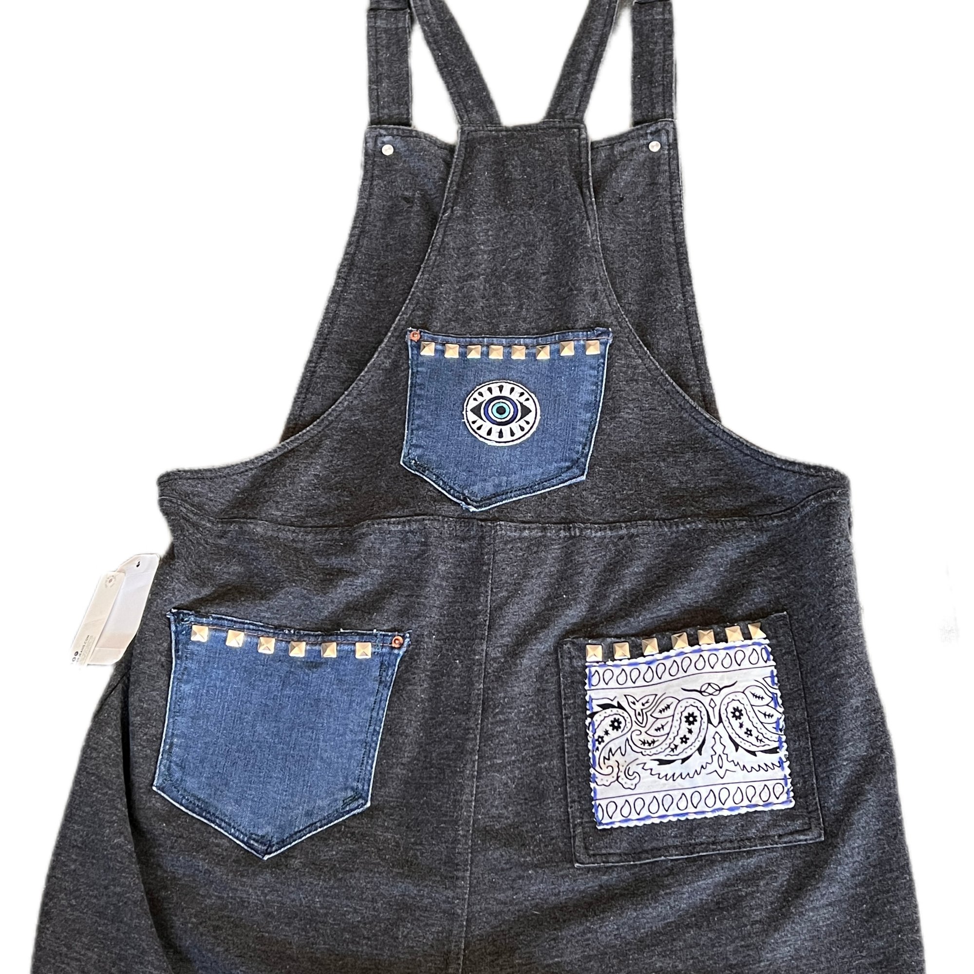 a drawstring waist & shoulders straps , both adjustable for your comfort. Cropped hem w- 4'' bandana cuff pyramid studs along top of bib & lining pockets , embroidery