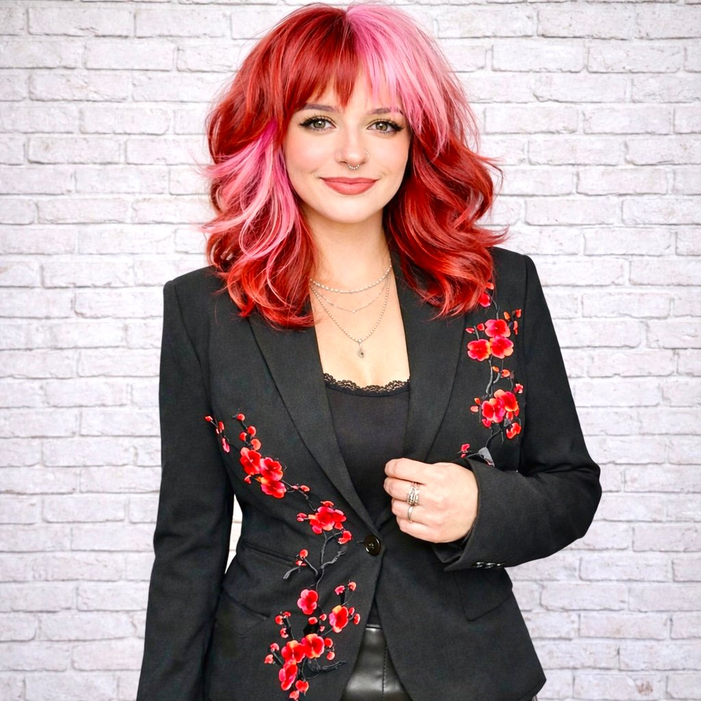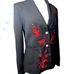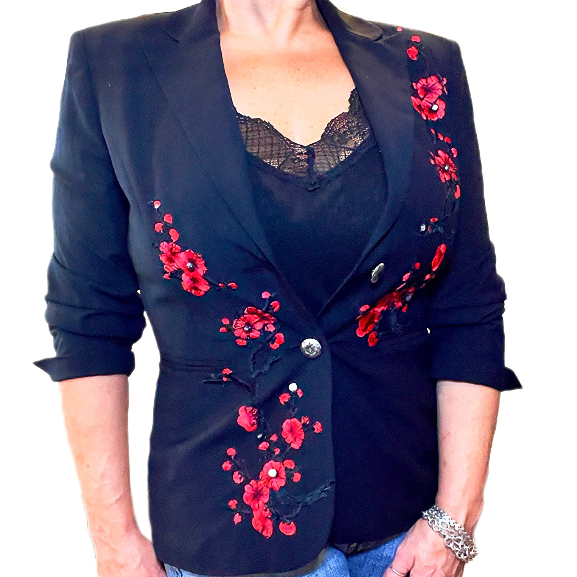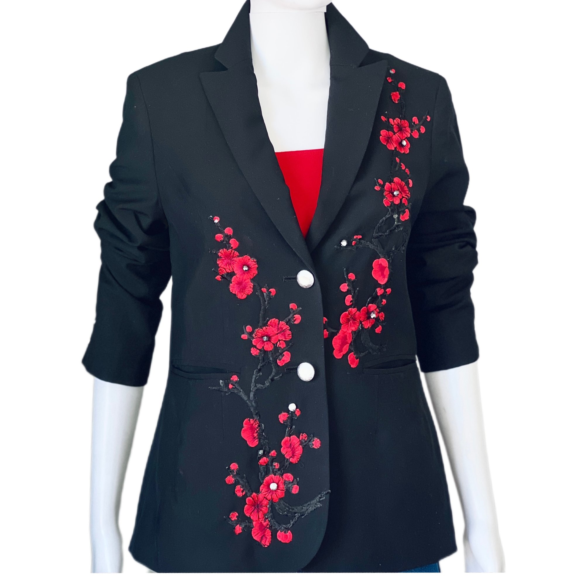 Womens Custom Black Blazer Red Cherry Blossom flowers down each side, a one of one signature piece