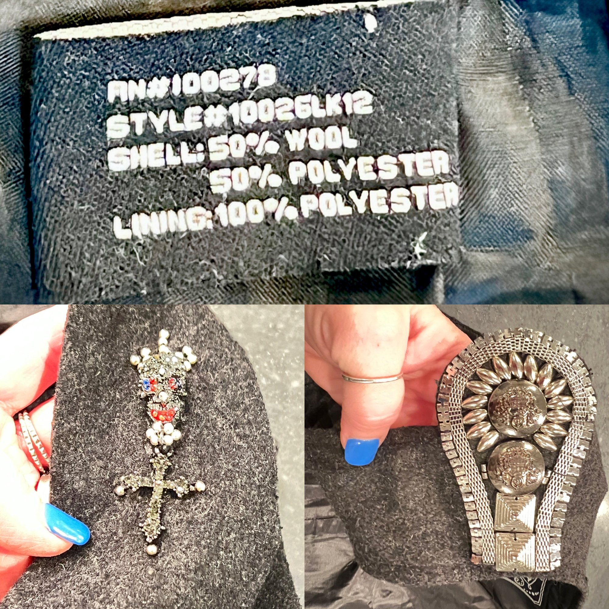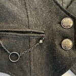 Silver hardware, added Silver shoulder epaulettes, created a design from an earring on left , I added blue & red rhinestones & tiny silver balls , features two functional pockets, dark Silver tone chains w- 2 beads on each pocket.