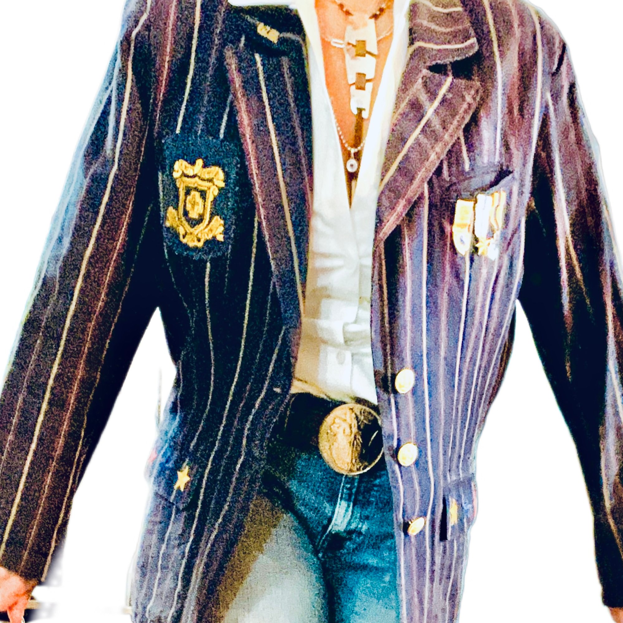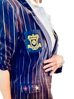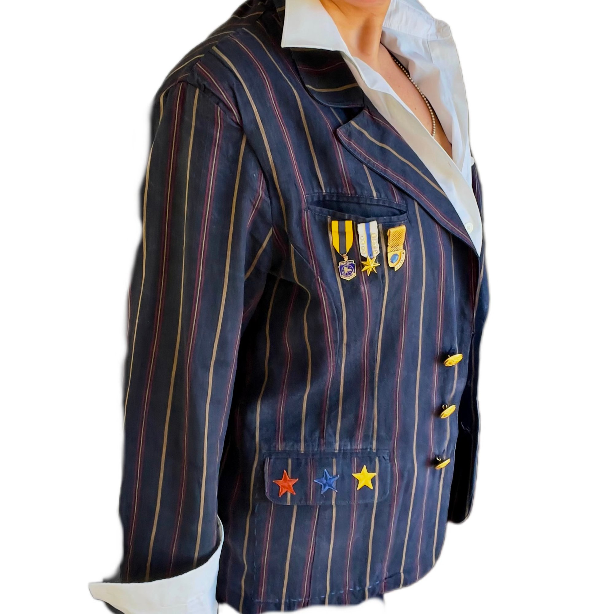 Women's Vintage Military Blazer Up cycled 1 of a kind , Navy w-red & gold pin stripes
