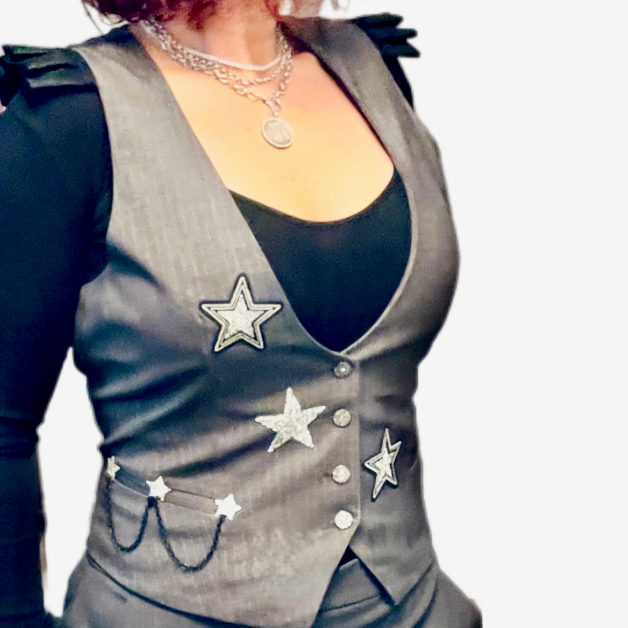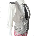 women’s gray vest, pinstripe waistcoat women, star patch vest, rock style vest women, edgy tailored vest, statement vest women, punk inspired vest, rock and roll vest, fitted women’s waistcoat, alternative fashion vest, unique women’s vest, layered outfit vest, boutique vest women, fashion vest with patches, standout vest piece