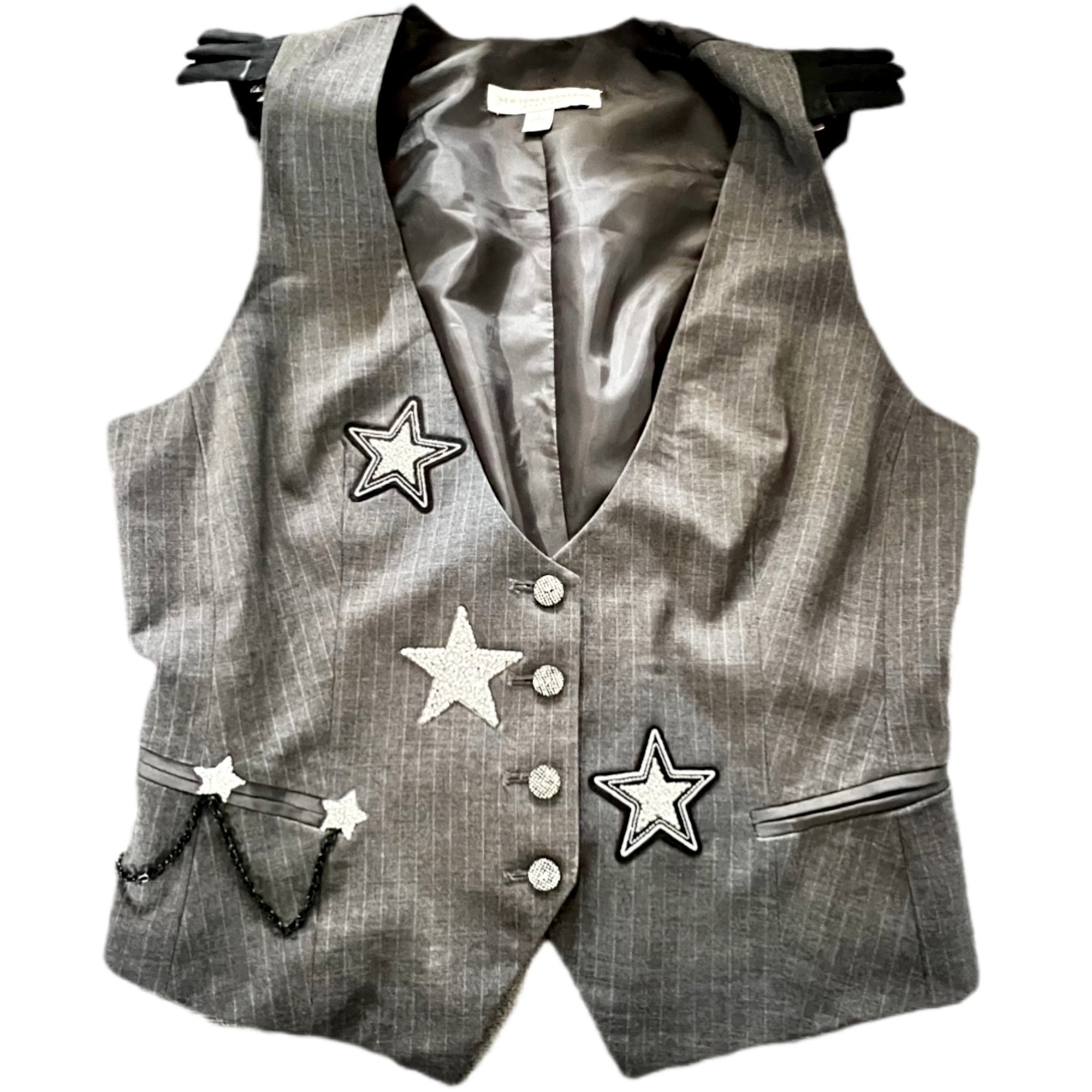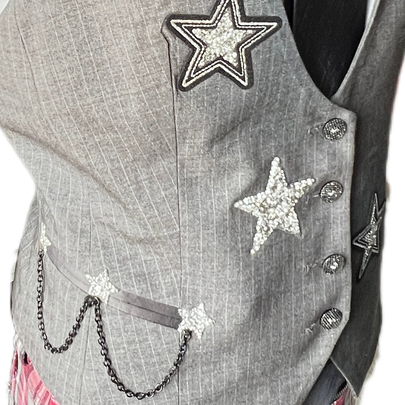 Women’s Gray Pinstripe Vest Vintage Y2K custom made w/ sparkling stars & pocket chain detail