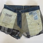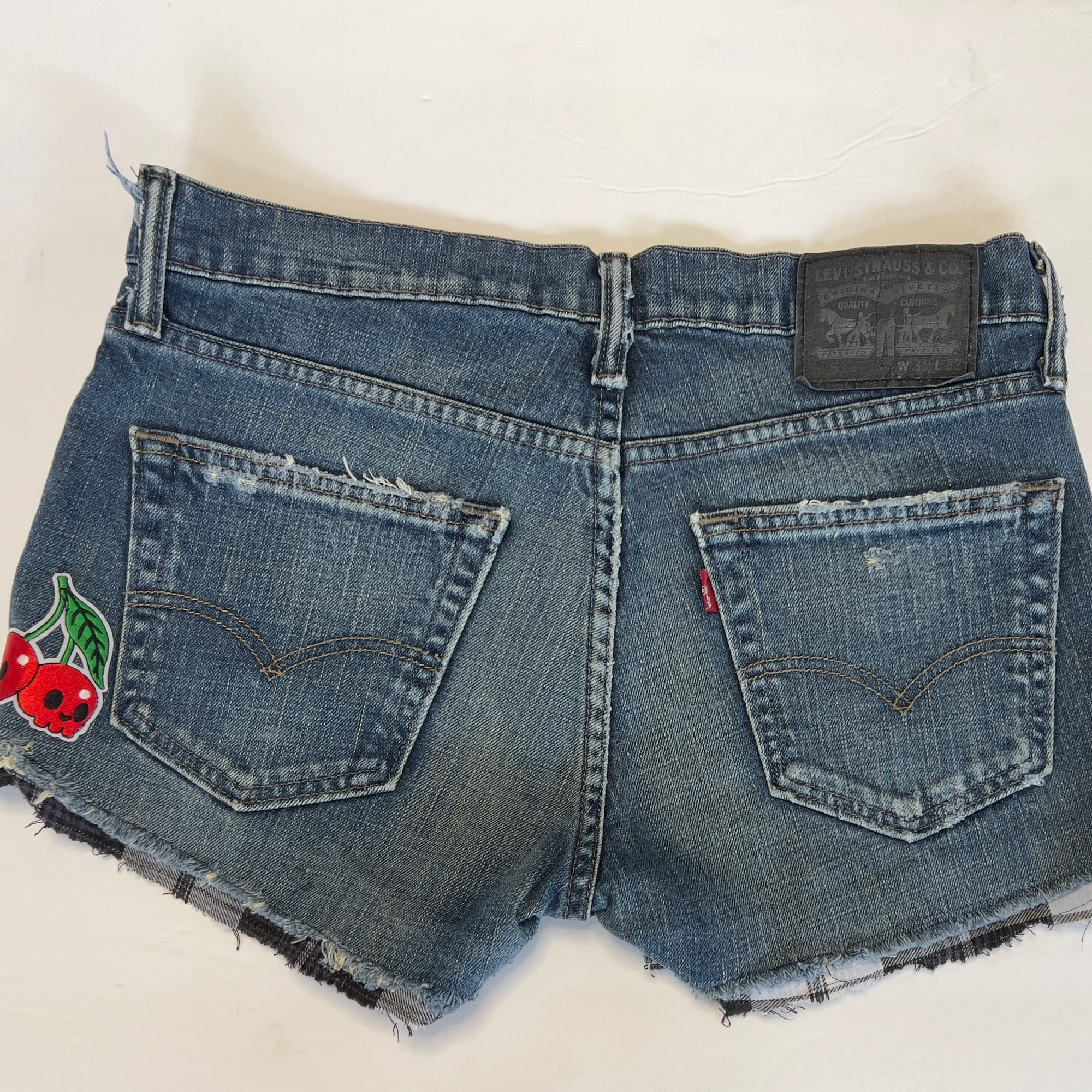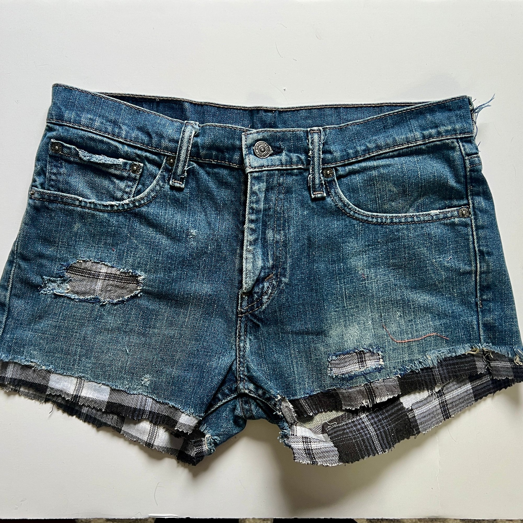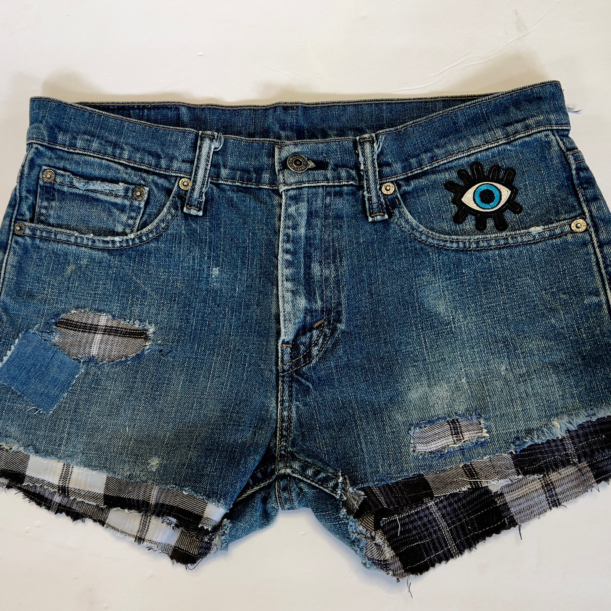 Women's Levis cut off jean shorts, grungey dark distressed denim w-flannel design evil eye patch