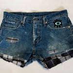 Custom Patchwork dark denim shorts with Evil Eye Patch | One-of-a-Kind Grunge / indie look.