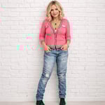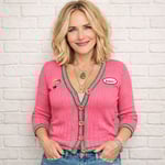Women's Silk Blnd Retro Style Cardigan, One of one , Pink signature sweater w/green trim